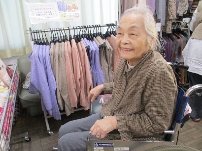 付き添いのご家族と一緒に品物を選ばれる方も、職員がお手伝いしながらお買い物をする方もそれぞれに楽しまれていたように見受けられました。このイベントの目的は必要品をそろえるためというよりは、ご利用者が楽しむことにあります。職員が「どうですか。」と薦める衣料品に「要らない。」と首を振るご利用者も「似合いますよ。」と言われて悪い気がしないということがお顔つきからもわかります。気にいったものがなく何も買わないご利用者もいらっしゃいますが、この会場はもちろん冷やかしOKなので、普段と違う雰囲気を楽しんでいらっしゃったように思います。